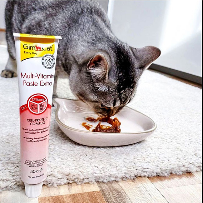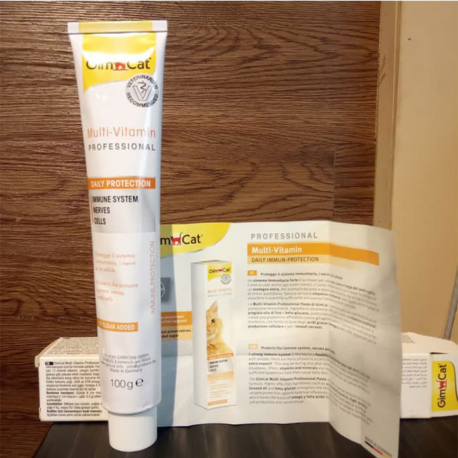 مصرف غذای گربه به تنهایی کافی نیست و گربه شما نیاز دارد از خمیر مولتی ویتامینی مناسب برای در رژیم غذایی خود بهرهمند گردد. خمیر مولتی ویتامین آلمانی نرم گربه جیم کت حاوی 12 ویتامین مورد نیاز برای گربه شما بوده و به سبب دارا بودن روغن بزرک (حاوی Linolenic اسید) و بتاگلوکان، موجبات افزایش ایمنی بدن گربه در برابر باکتریها و همچنین تقویت سیستم عصبی آن را فراهم میآورد. شیوه استفاده از این خمیر به این گونه است که روزانه به مقدار 3 گرم یا 6 سانتی متر خمیر (منظور خمیری است که از تیوپ بیرون میآید) را به صورت مستقیم از لوله تیوپ یا به صورت مخلوط شده با غذای گربه به وی بدهید. لازم به ذکر است پیش از باز شدن این محصول میتوان آن را در دمای اتاق نگهداری نمود اما پس از باز شدن آن لازم است در محیط خنک نگهداری شود. از دیگر مزایای این خمیر این است که فاقد شکر، افزودنی های غیر مجاز و گلوتن بوده و به صورت مصنوعی دارای طعم نشده است.
