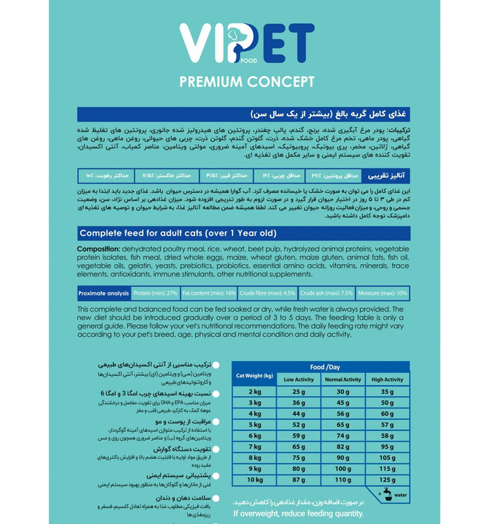 غذای گربه بالغ VIPET با استفاده از مواد اولیه بسیار مرغوب، ترکیب متوازن و ایده آل انرژی، پروتئین و ریزمغذی ها، و بالاترین استاندارهای بهداشتی بیش از هرچیز آسایش و سلامت بلند مدت حیوانات خانگی و آرامش همراهان انسانی آنها را در نظر گرفته است. تعادل مواد مغذی، تقویت سیستم ایمنی، شادابی پوست و مو، تقویت دستگاه گوارش، و الزامات کبدی و کلیوی هنگام تولید این محصول مورد توجه قرار گرفته است.
