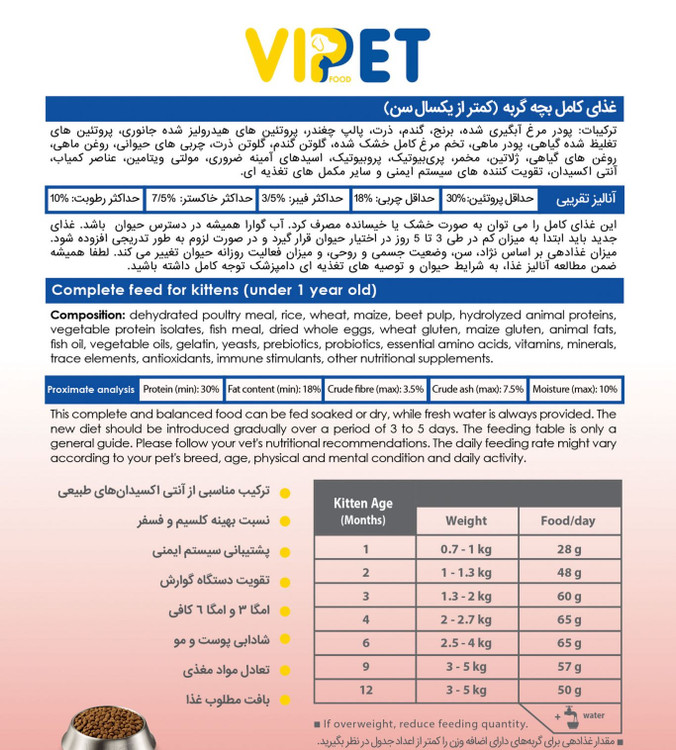غذای گربه بالغ VIPET با استفاده از مواد اولیه بسیار مرغوب، ترکیب متوازن و ایدهآل انرژی، پروتئین و ریزمغذیها و بالاترین استاندارهای بهداشتی بیشتر از هر چیز، آسایش و سلامت بلندمدت حیوانات خانگی و آرامش همراهان انسانی آنها را در نظر گرفته است. تعادل مواد مغذی، تقویت سیستم ایمنی، شادابی پوست و مو، تقویت دستگاه گوارش، و الزامات کبدی و کلیوی هنگام تولید این محصول مورد توجه قرار گرفته است.