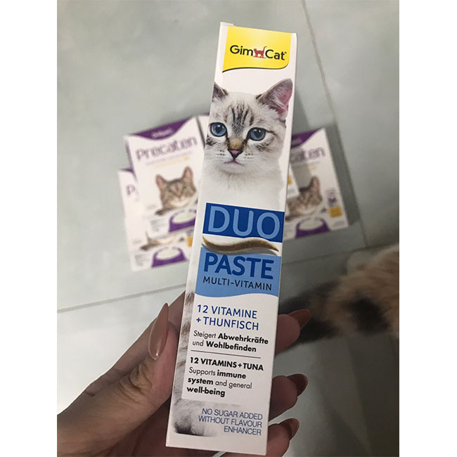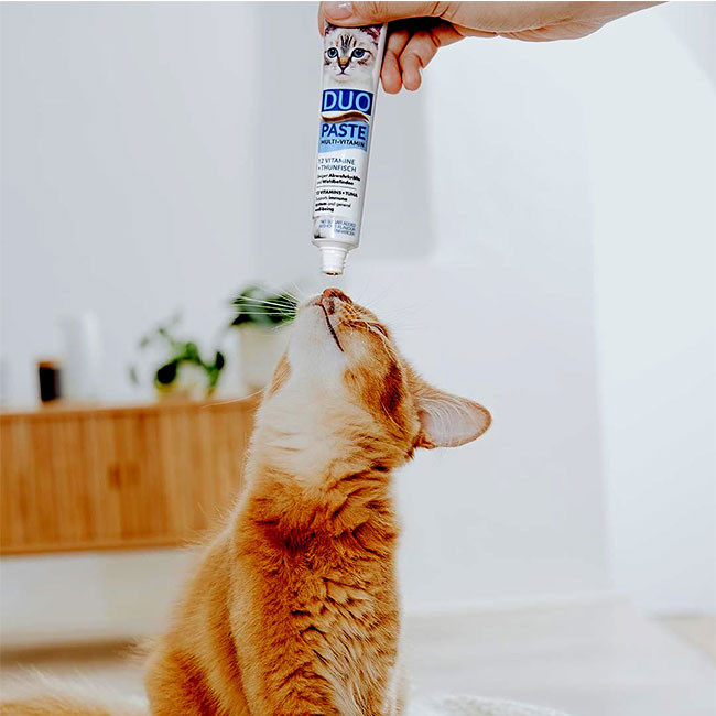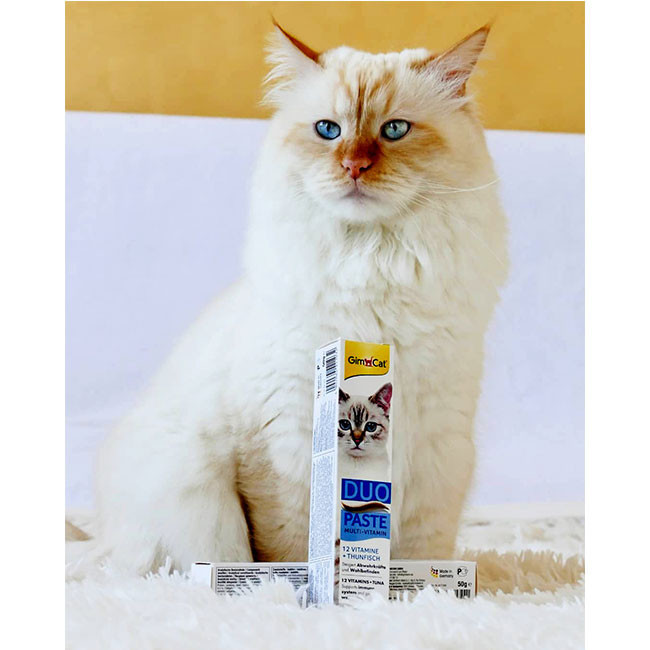 مصرف غذای گربه به تنهایی کافی نیست و گربه شما نیاز دارد از خمیر مولتی ویتامینی مناسب در رژیم غذایی خود بهرهمند گردد. خمیر مولتی ویتامین دوقلوی آلمانی برند جیم کت با طعم ماهی تن و وزن 50 گرمی حاوی 12 نوع ویتامین بوده و برای تمامی نژادهای گربه در تمامی سنین مناسب میباشد. طعم ماهی تن سبب میشود گربه شما با رغبت بیشتری این مولتی ویتامین را مصرف کند. این خمیر موجب بهبود سیستم ایمنی بدن گربه شده و از ابتلا به بسیاری از بیماریها جلوگیری میکند. این محصول حاوی هیچ گونه مواد و افزودنی های شیمیایی، طعم دهنده های مصنوعی، نمک، شکر و گلوتن نمی باشد. شیوه استفاده از این خمیر به این گونه است که روزانه به مقدار 3 گرم یا 6 سانتی متر خمیر (منظور خمیری است که از تیوپ بیرون میآید) را به صورت مستقیم از لوله تیوپ یا به صورت مخلوط شده با غذای گربه به وی بدهید. لازم به ذکر است پیش از باز شدن این محصول میتوان آن را در دمای اتاق نگهداری نمود اما پس از باز شدن آن لازم است در محیط خنک نگهداری شود.