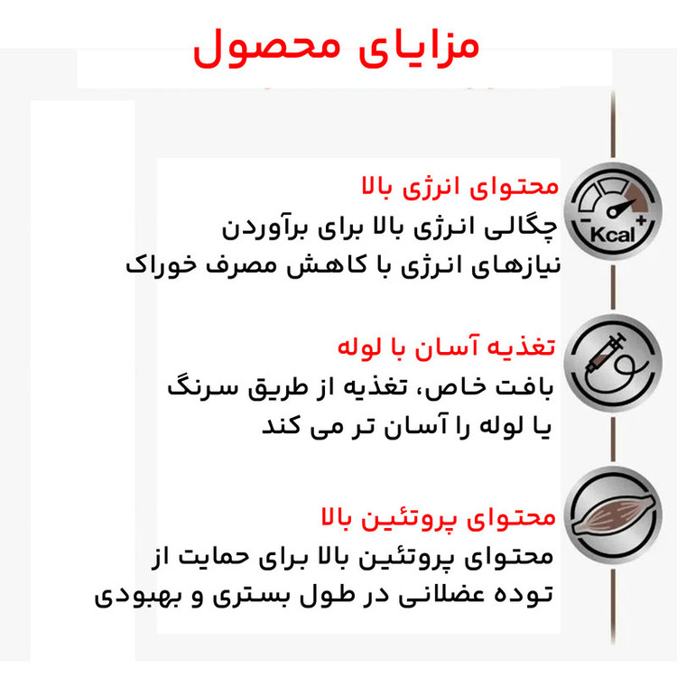 - انرژی بالا: برای تأمین نیازهای انرژی بالا در دوره بهبودی بدون نیاز به حجم زیاد غذا.