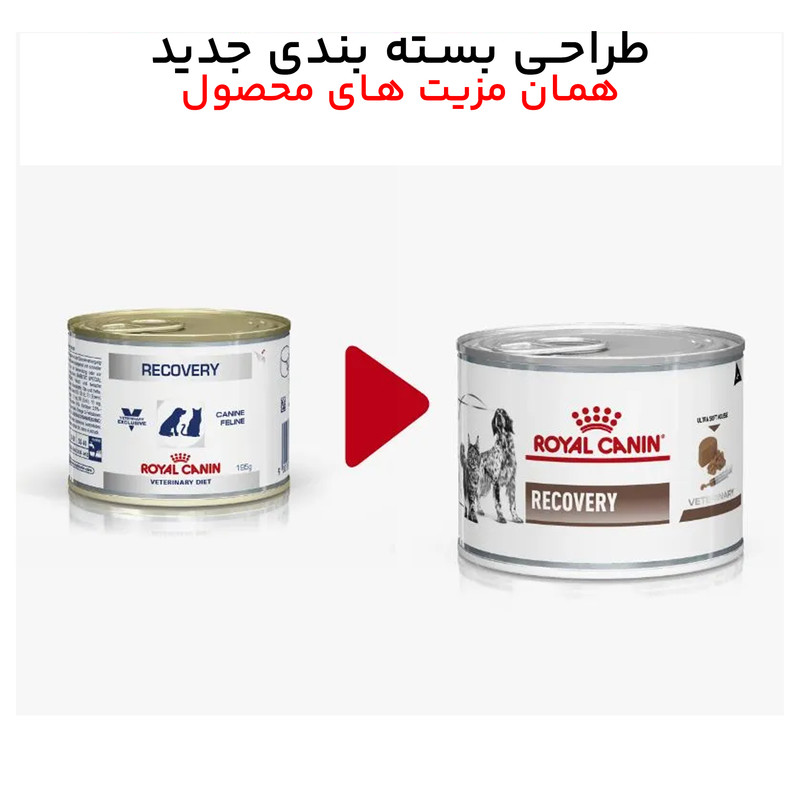 کنسرو ریکاوری رویال کنین سگ و گربه (Royal Canin Recovery) با طعم مرغ و گوشت یک غذای مرطوب مخصوص سگها و گربههایی است که در دوره بهبودی از بیماری، جراحی یا ضعیف بودن عمومی قرار دارند. این غذا به منظور بهبود سریعتر و تامین نیازهای تغذیهای خاص در دوره درمانی طراحی شده است.