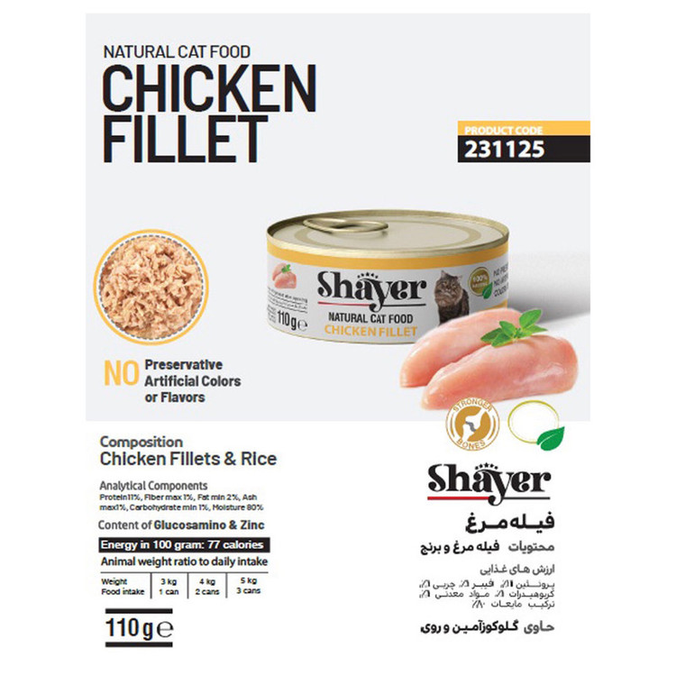 کنسرو گربهشایر باطعم مرغ و هویج در سس شامل تکه های طبیعی مرغ همراه با تکه هایی طبیعی از هویج و کمی برنج در آب و همچنین غلیظ شده سس گوشت است. این کنسرو کمک به هضم آسان تر غذا میکند و در عملکرد دستگاه گوارش نقش بسزایی دارد.